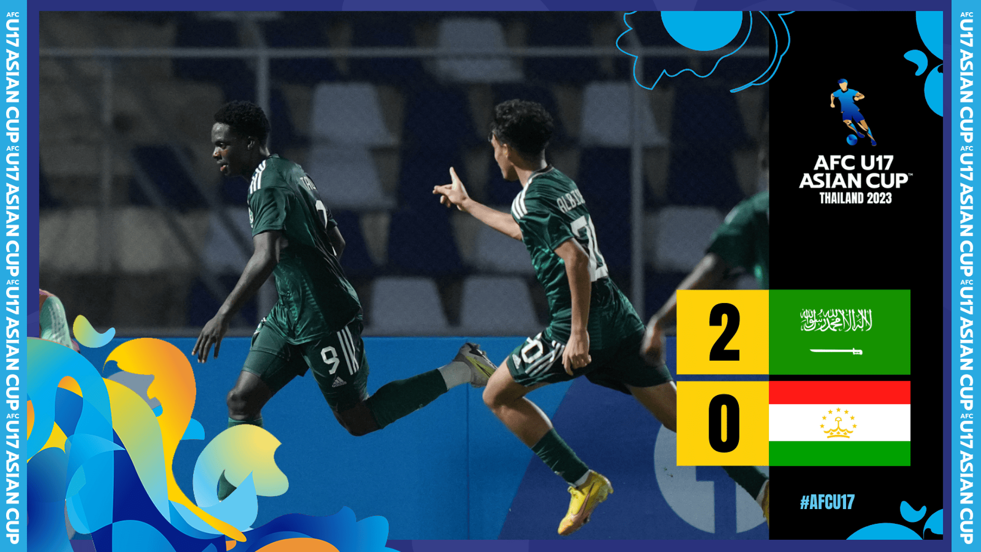 تشونبوري - ضمن منتخب السعودية التأهل للدور ربع النهائي بعد فوزه على طاجيكستان 2-0 يوم الاثنين على ستاد مدينة تشونبوري، ضمن الجولة الثانية من منافسات المجموعة الثالثة في كأس آسيا للناشئين تحت 17 عاماً 2023 في تايلاند.