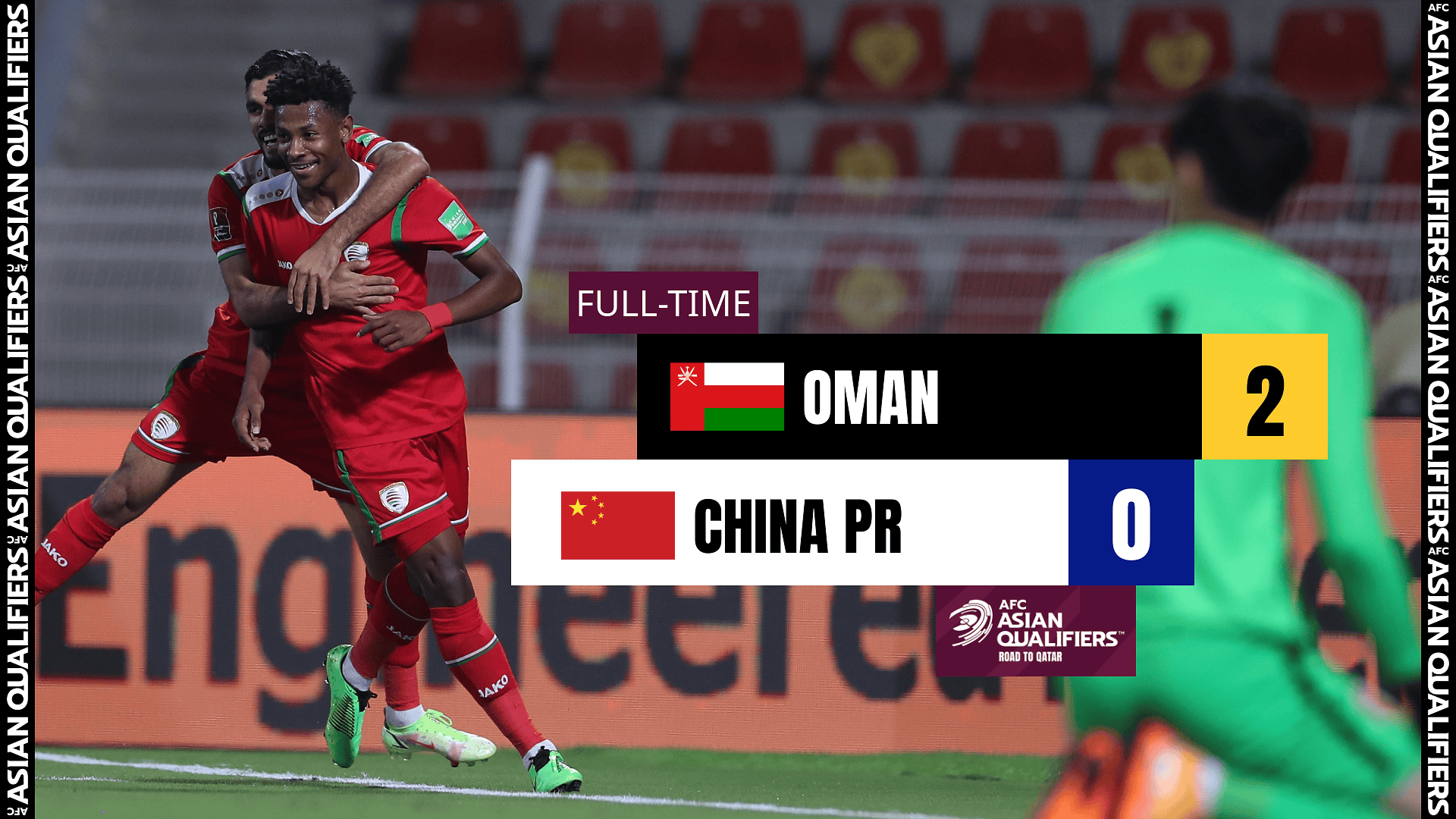مسقط - فاز منتخب عُمان على الصين 2-0 يوم الثلاثاء على ستاد مجمع السلطان قابوس الرياضي في مسقط، ضمن الجولة العاشرة والأخيرة من منافسات المجموعة الثانية، في الدور النهائي من التصفيات الآسيوية - الطريق إلى قطر.