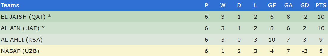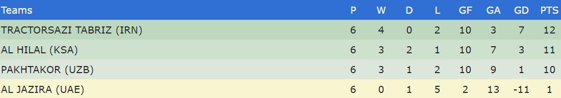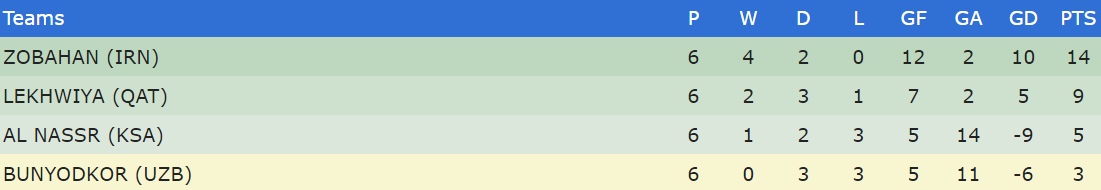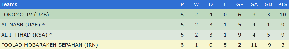 WEDNESDAY 4 May Group A Foolad Mobarakeh Sepahan 0-2 Al Ittihad Video Highlights Lokomotiv 0-0 Al Nasr Video Highlights (Lokomotiv and Al Nasr through to the last 16) **