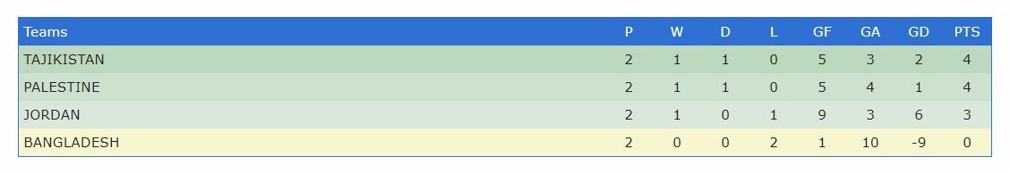 The victory sees Palestine, who now have four points to their name, go second in the group behind table-topping Tajikistan on goal difference. Jordan are one point behind the high-flying duo in third. In a game that provided twists and turns galore, Jordan raced into a two-goal lead within the opening 31 minutes courtesy of strikes from Yazan Al Arab and Mohammad Mahmoud Hashem Alrazem. However, Palestine responded with a goal of their own seven minutes before the break when a superb Hazem Abuhammad free-kick found the net to hand his side a vital lifeline. The Palestinian momentum was to continue after the break, Mahmoud Yousef drawing his side level with 66 minutes on the clock at the Dura Stadium thanks to a fine run and shot, and Bahaa Wridat firing home what would prove to be the winner with 14 minutes to play. In the group's final round of games on Sunday, Palestine will face Bangladesh, while Jordan are set to tackle Tajikistan.