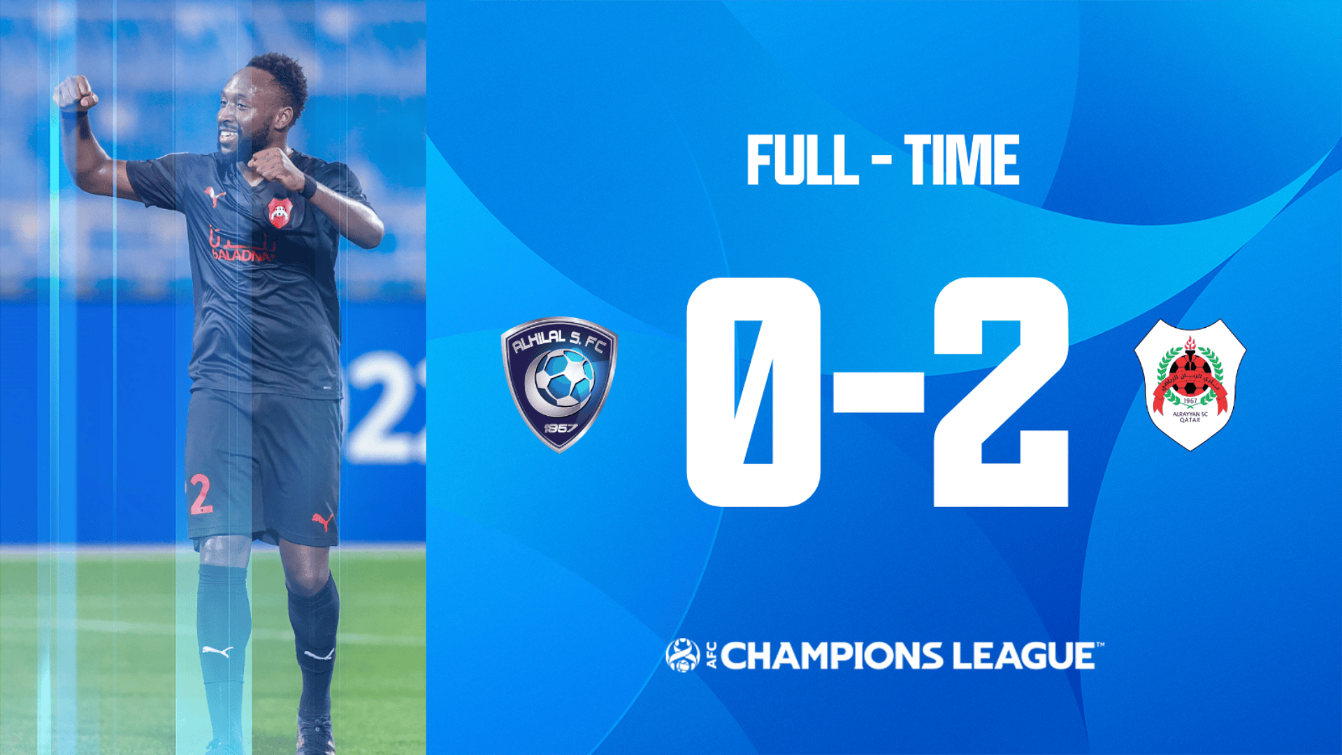 الرياض - فاز نادي الريان القطري على الهلال السعودي 2-0 يوم الأربعاء على ستاد الأمير فيصل بن فهد في الرياض، ضمن الجولة السادسة والأخيرة من منافسات المجموعة الأولى في دوري أبطال آسيا 2022.